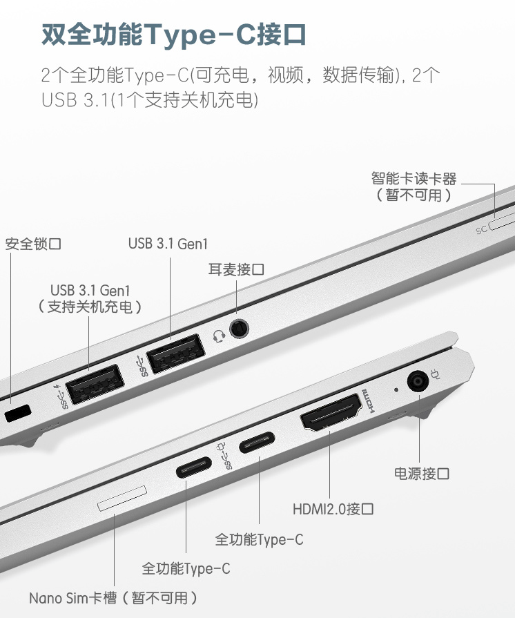 接口方面,全系列在接口配置方面相同,均有两个USB 3.1 Gen1(其中一个支持关机充电)、两个全功能Type-C、一个HDMI 2.0接口、以及一个耳麦接口。