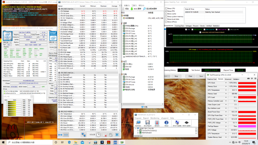 在“狂飙模式”下,使用Stress FPU+Furmark进行压力测试。