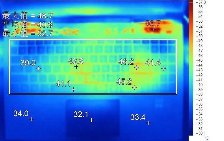 表面温度如上图所示,键盘键帽温度最高为46.2℃,WASD键位区域在39℃附近,方向键45.2℃。左腕托温度为34℃。