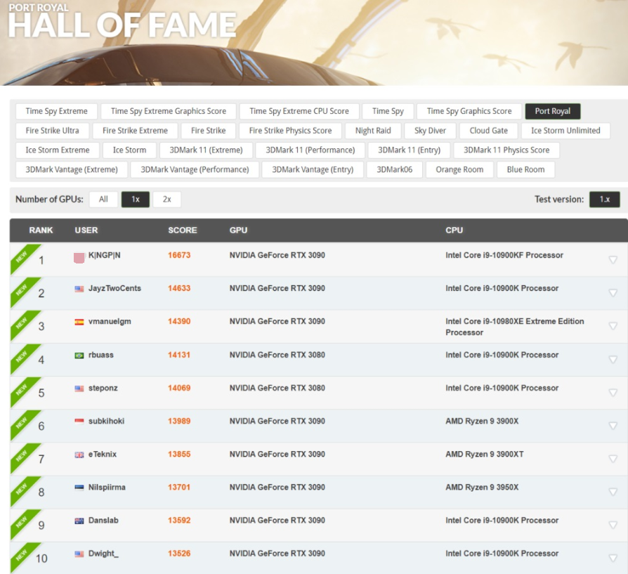 KINGPIN此次使用的显卡,正是其与EVGA的合作款GeForce RTX 3090 KINGPIN Hybrid(这里我要吐槽一下这卡的外观是真丑,难道这就是扮猪吃老虎?),测试项目为3DMark Port Royal,最终得分16,673分。