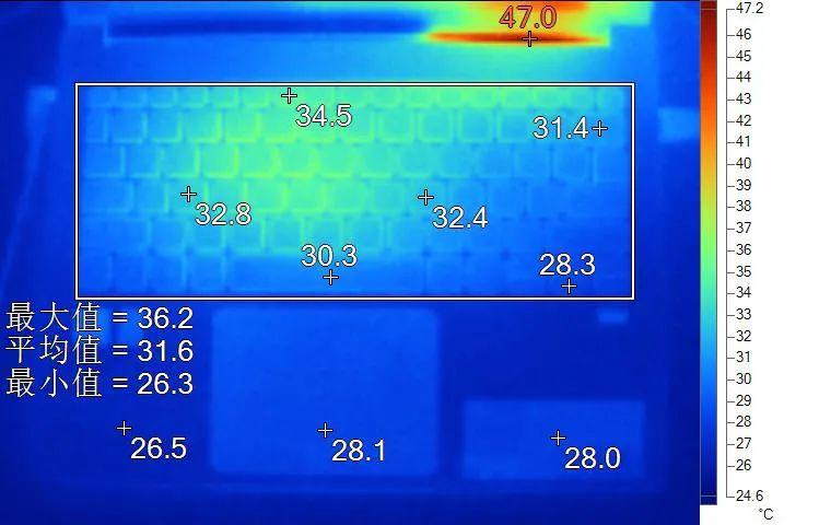 满载表面温度如上图所示,整体温度都不高,键帽最高处34.5℃,WASD区域33℃不到,其他地方几乎无热感。