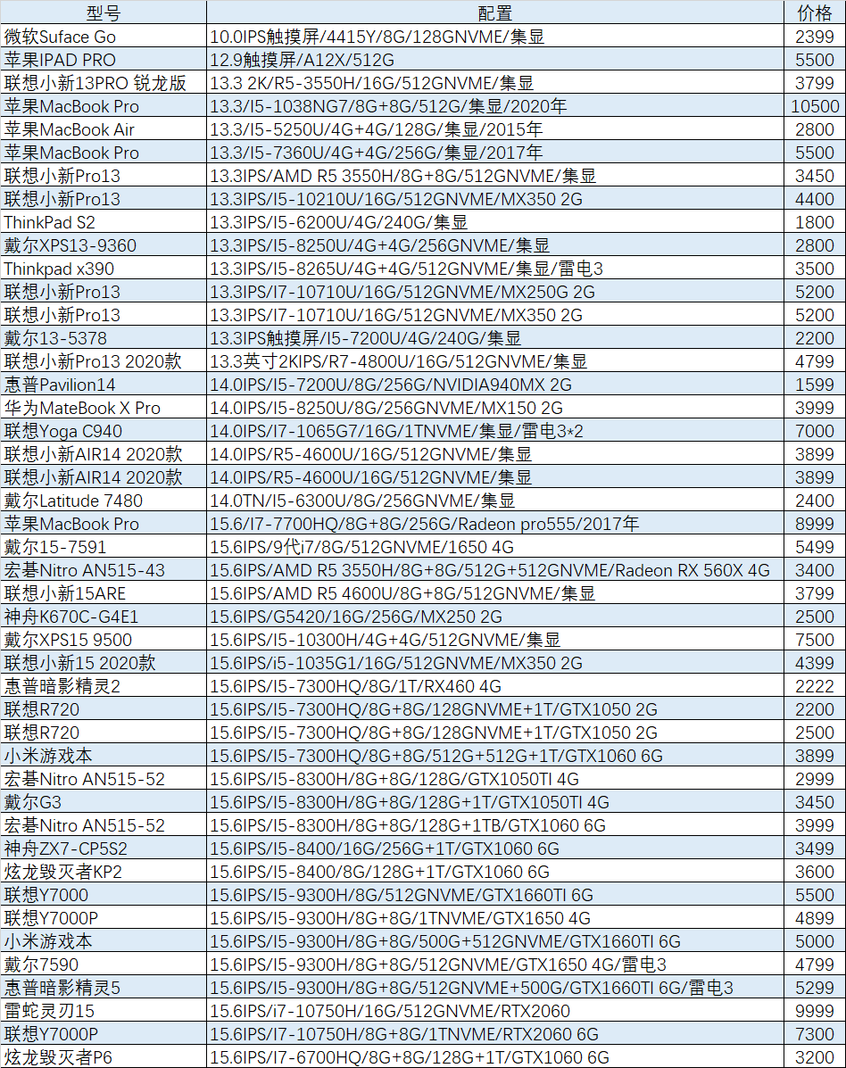 上周已售出机型:(无法列出成色,价格仅供参考)