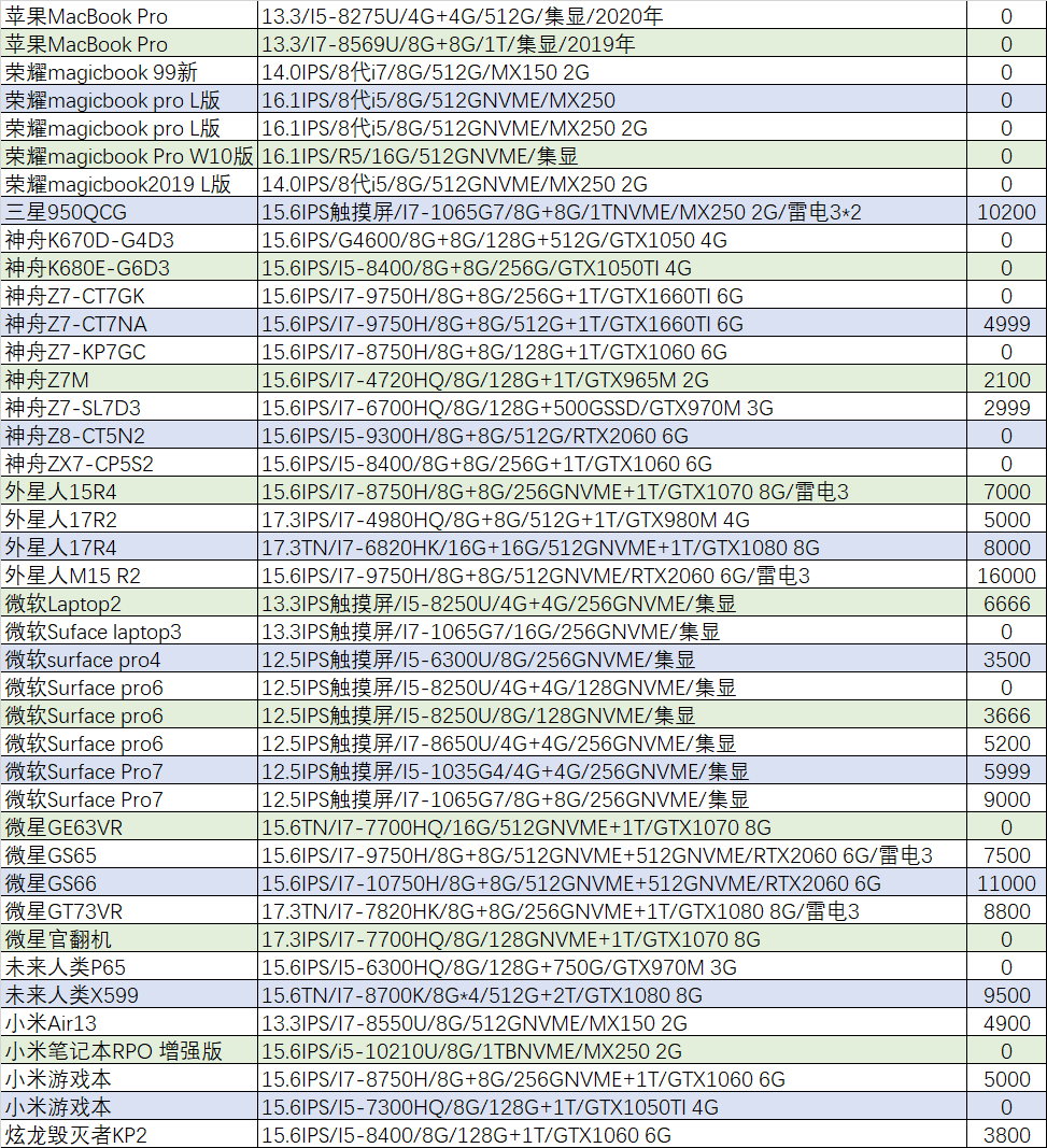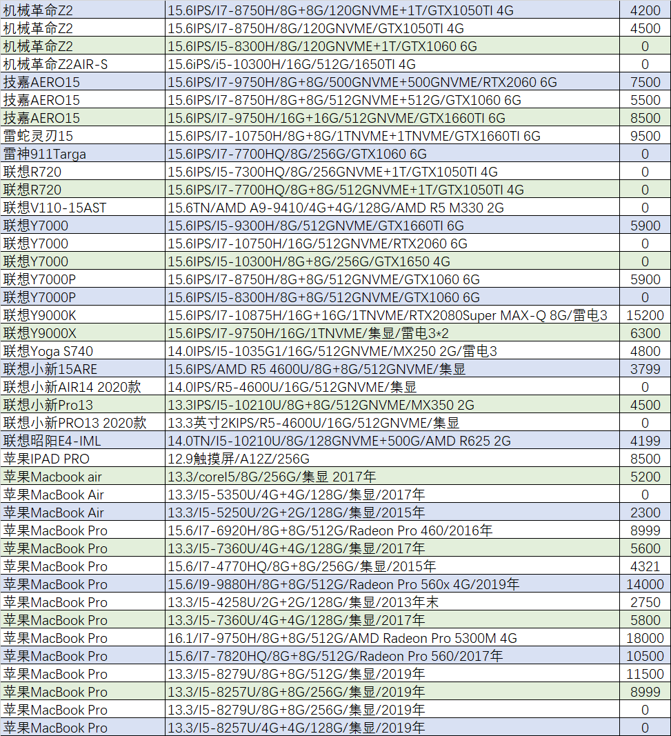 本周待售机型:(无法列出成色,价格仅供参考,0元表示卖家未定价)