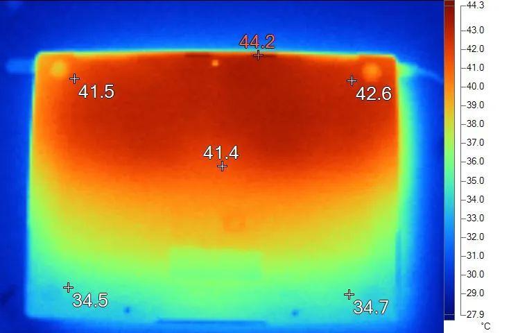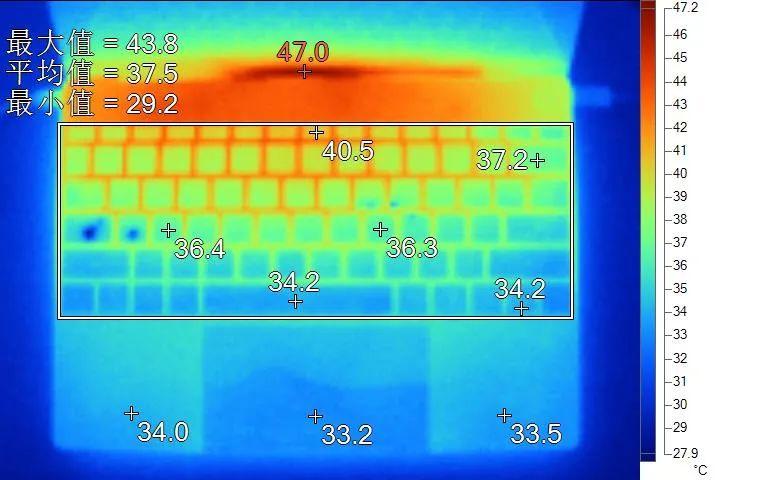 表面温度如上图所示,键盘键帽温度最高为40.8℃,WASD键位区域在37℃附近,方向键33.7℃。左腕托温度为34.3℃,背面中心点温度39.8℃。