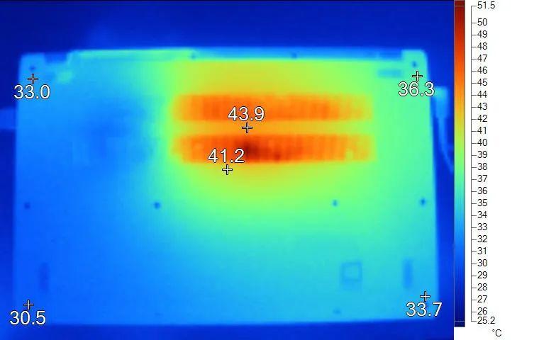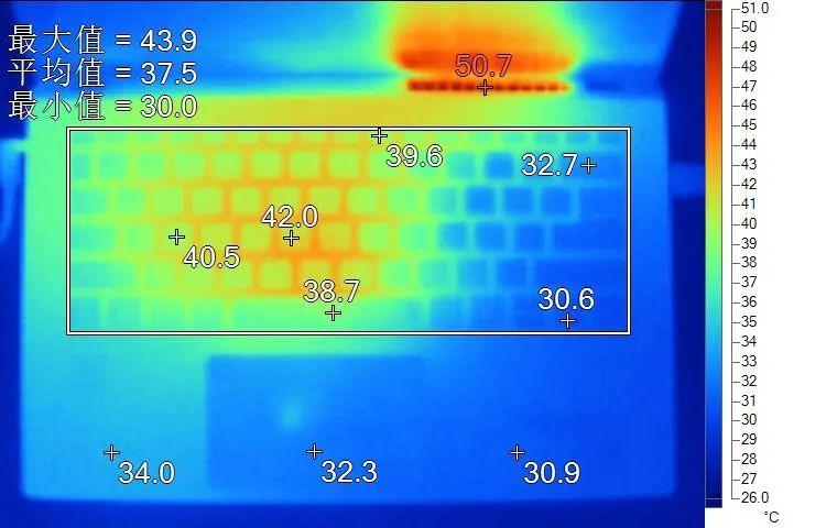 表面温度如上图所示,键盘键帽温度最高为42℃,WASD键位区域在40℃附近,方向键30.6℃,背面最高温度约44℃。