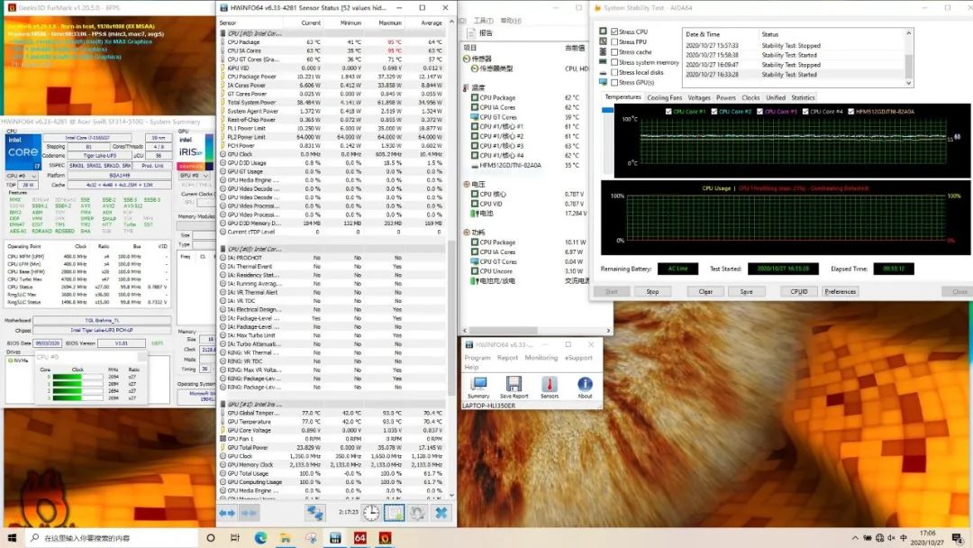 针对轻薄本,我们使用负载较低的Stress CPU+Furmark进行压力测试。