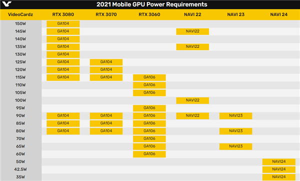 知名媒体VideoCardz,也公布了他们收集到的消息,对比AMD Navi 22/23/24和NVIDIAG A104/GA106核心的功耗。
