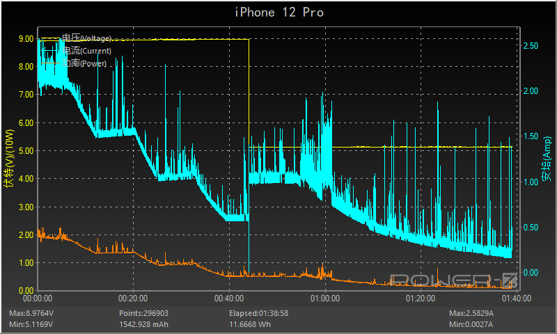 可以看到,iPhone不愧是iPhone,除了前十分钟的功率能够保持在15-20W左右,25分钟后功率直接下降到10W,45分钟后由PD的9V档位转换成经典5V1A,功率保持在5W。