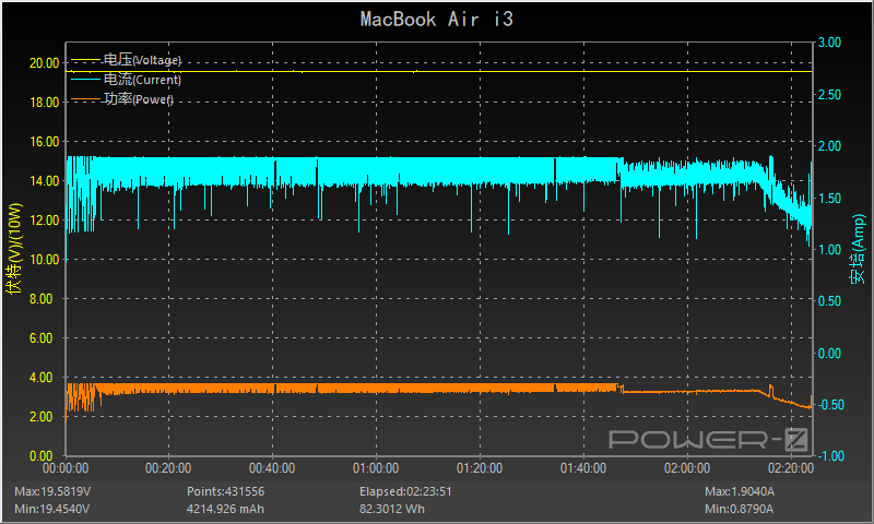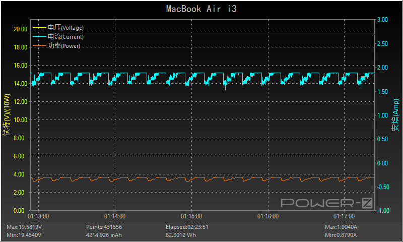 但不知道是不是苹果的充电策略比较独特,它的功率曲线处于一个十几秒一波动的周期,并且一直持续到充满电,电压保持在19.5v左右,充满总用时2小时23分钟左右。