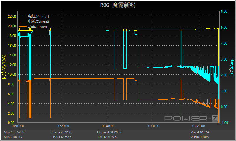 可以看到,ROG魔霸前期几乎保持了19.5V 5A的大直线,保持90W以上的功率,50分钟后功率降到45W,1小时10分钟后功率开始下降至充满的30W左右,充满总用时仅1小时30分钟。