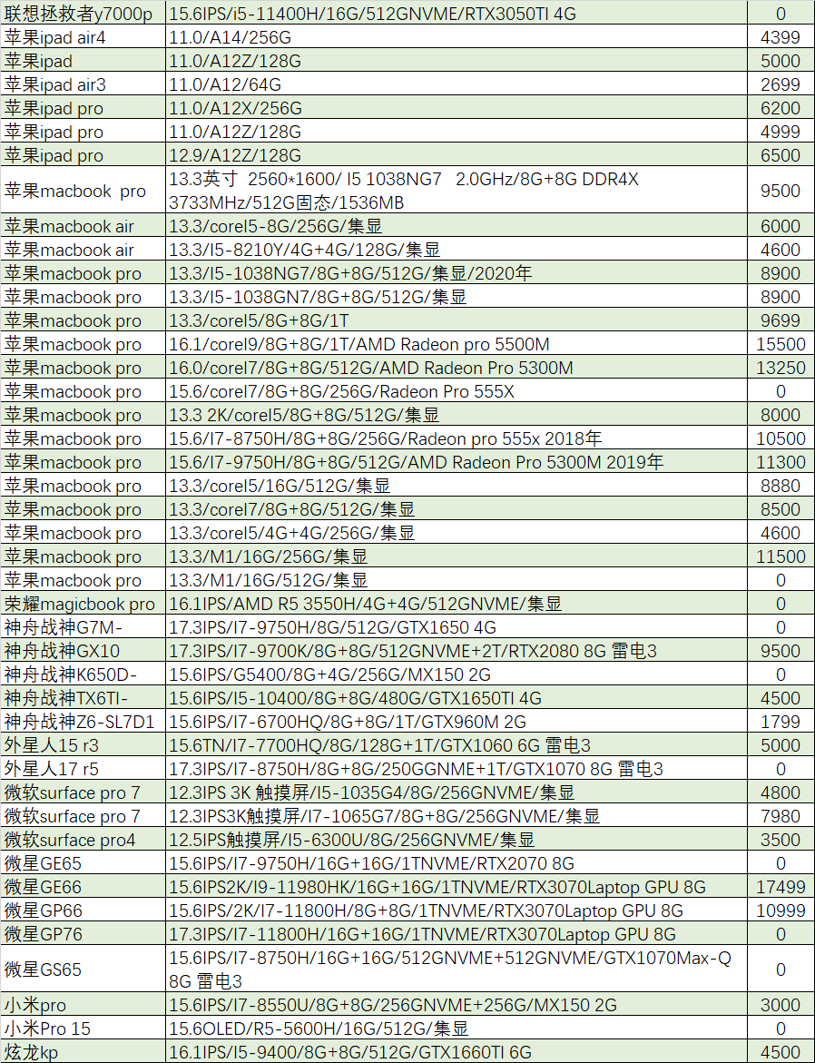 上周已售出机型:(无法列出成色,价格仅供参考)