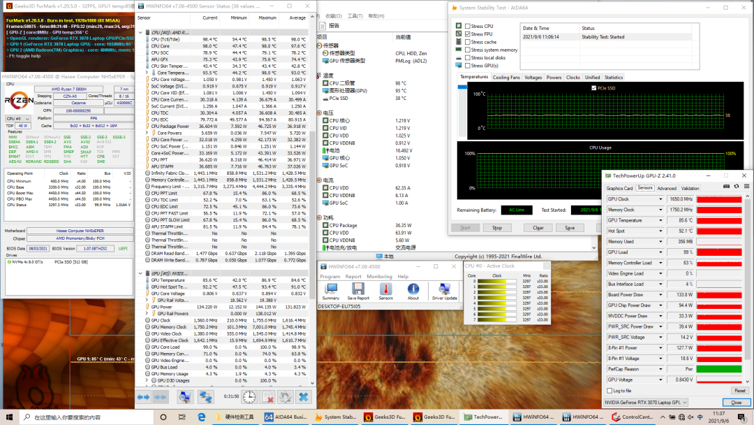 在满载状态下,CPU温度最高98.5℃,稳定在98.4℃左右,功耗36.6W,频率3.3GHz左右。