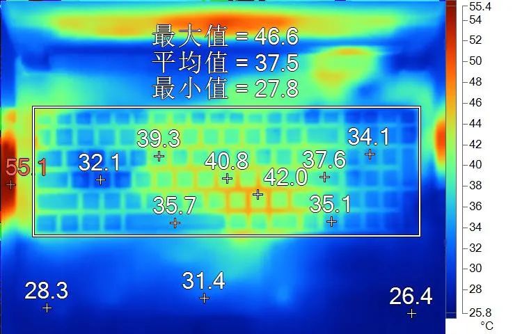 表面温度如上图所示,键盘键帽最高42℃出现在键盘中部,WASD键附近约为32.1℃,方向键35.1℃。左腕托温度为28.3℃。