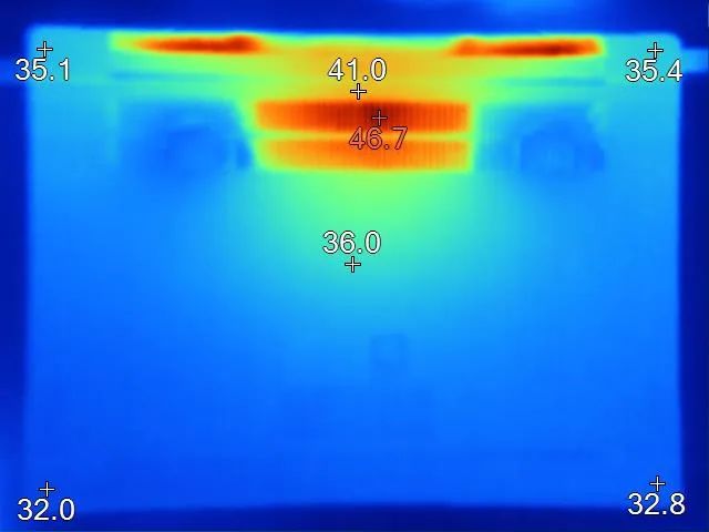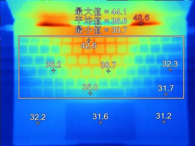 表面温度如上图所示,键盘键帽最高42.6℃出现在键盘中上部位置,WASD键区域为36.2℃,方向键31.7℃,背面中心点36.0℃。