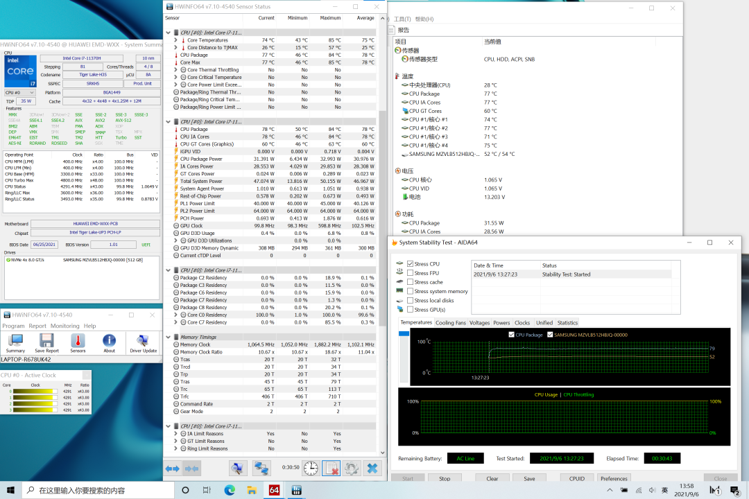 在满载状态下,CPU温度最高84℃,稳定在78℃,功耗31.4W,频率维持在4.3GHz,达到了i7-11370H的全核最大睿频。