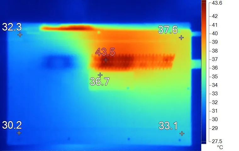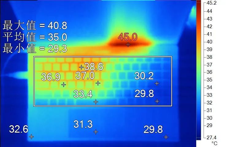 表面温度如上图所示,键盘键帽最高38.6℃出现在键盘左侧区域,WASD键为36.9℃,方向键29.8℃。背面中心点36.7℃。