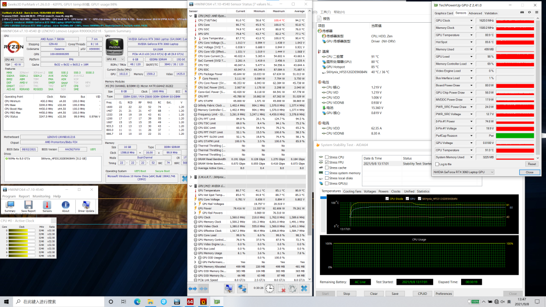 总的来说,联想 拯救者 R9000X 2021的散热表现不错,性能释放非常猛,核心温度也控制得很好,但表面温度很高,毕竟这是一款不到20mm厚的游戏本,表面温度再低就不科学了。