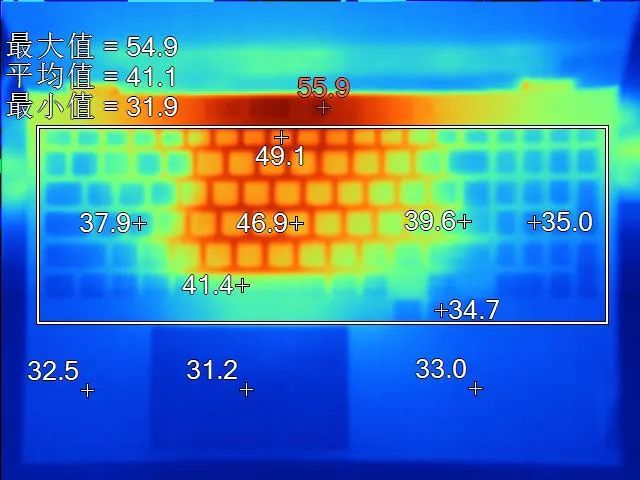 表面温度如上图所示,键盘键帽最高49.1℃出现在键盘中上部,WASD键附近约为37.9℃,方向键34.7℃。