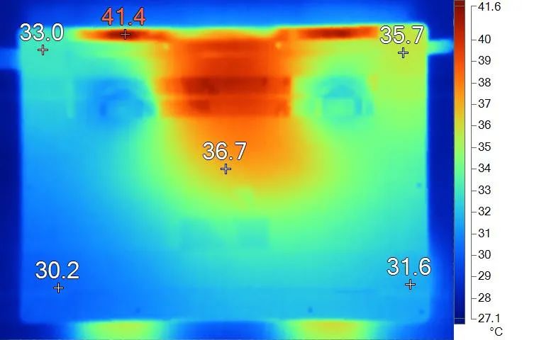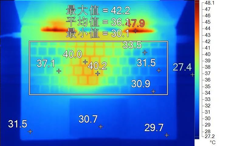 表面温度如上图所示,键盘键帽最高40.2℃出现在键盘中部区域,WASD键37.1℃,方向键30.9℃。背面中心点36.7℃。