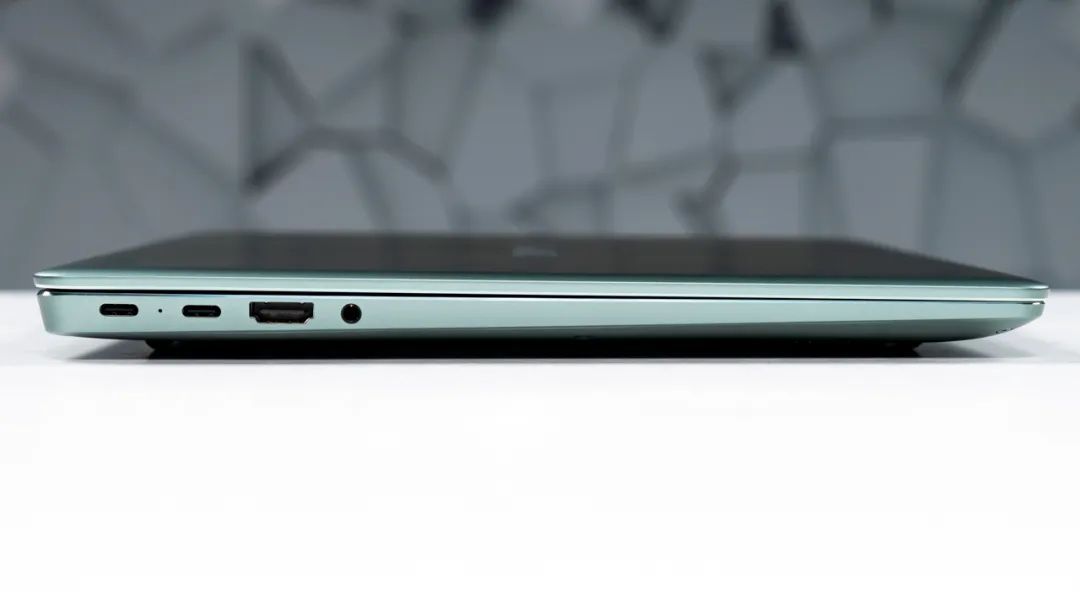接口方面, 机身左侧有两个USB-C接口、HDMI1.4b,3.2mm耳麦口,机身右侧有一个USB3.2 Gen1 Type-A接口,种类比MateBook13s更丰富,但仅有1TB顶配版搭载雷电4接口。
