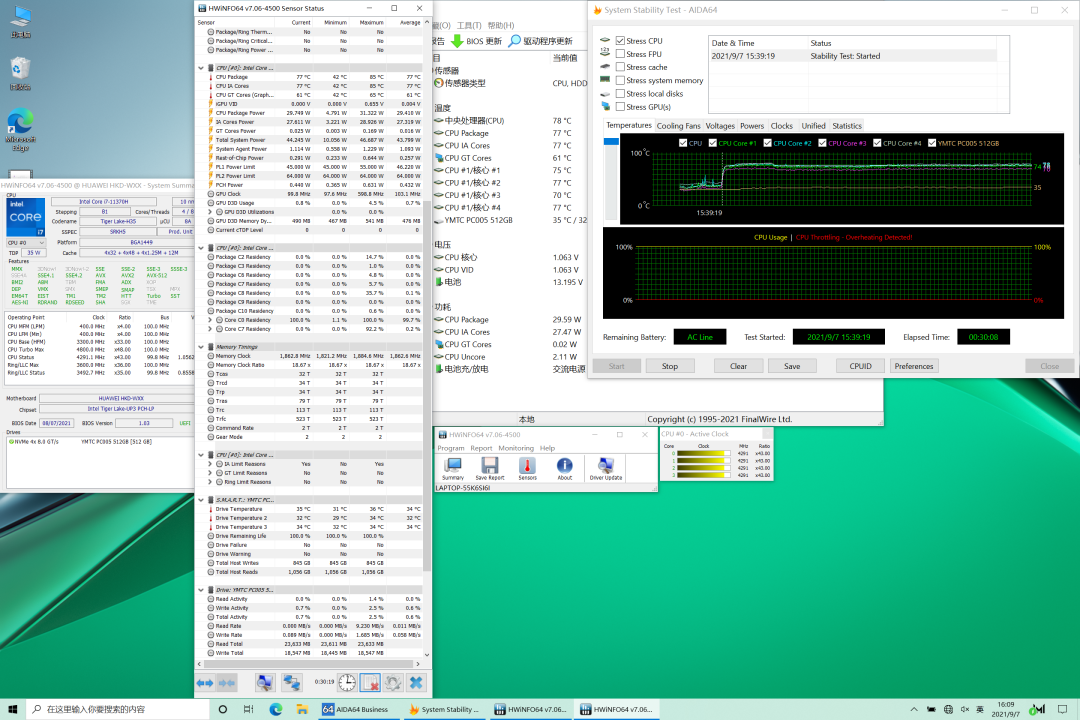 在满载状态下,CPU温度最高85℃,稳定在77℃,功耗29.7W,频率维持在4.3GHz,达到i7-11370H的全核最大睿频。