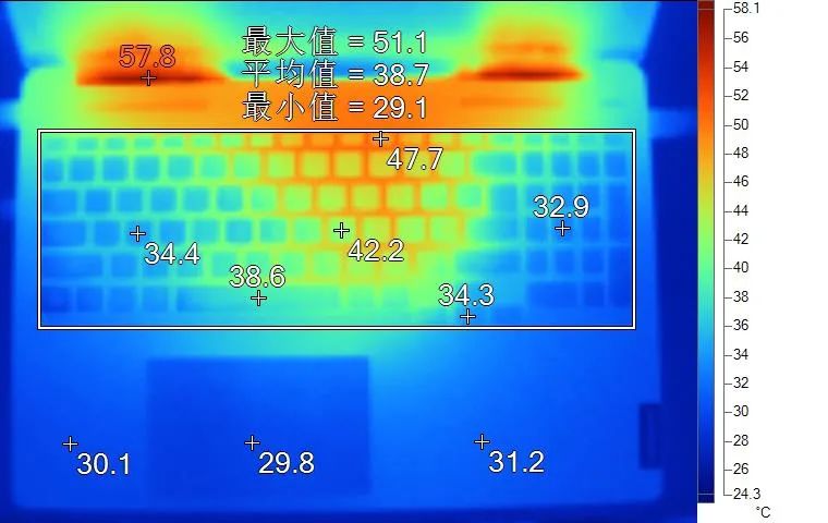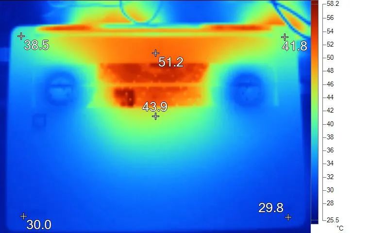 表面温度如上图所示,键盘键帽温度最高为47.7℃,WASD键位区域在34℃附近,方向键34.3℃。背面温度最高51.2℃,中心点温度43.9℃。