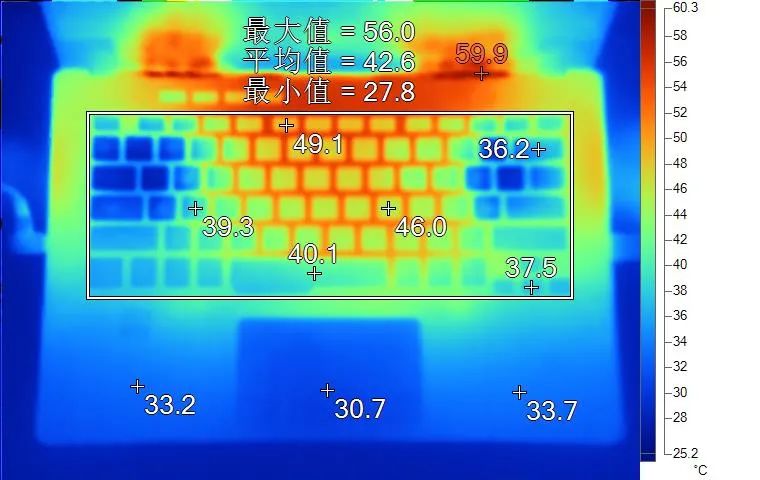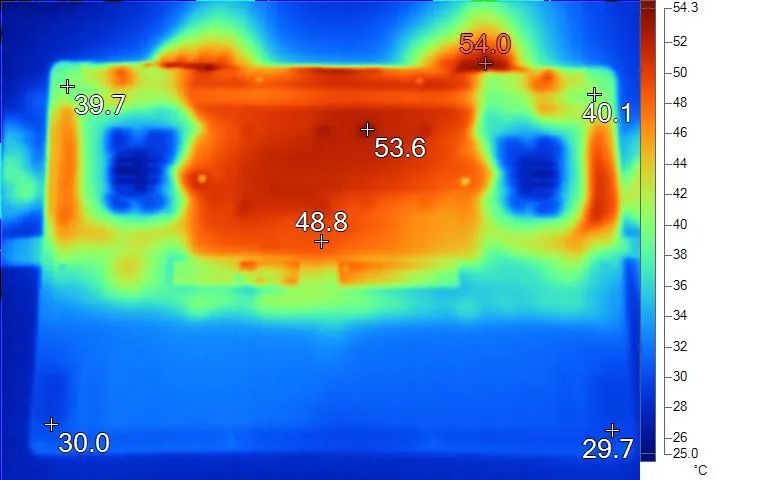 表面温度如上图所示,键盘键帽温度最高为49.1℃,WASD键位区域在39℃附近,方向键37.5℃。背面温度最高约53.6℃,中心点温度48.8℃。
