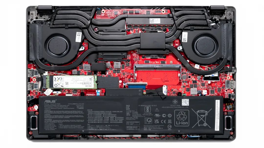 上图是ROG 幻14 2021的拆机实拍图,4热管双风扇的组合。