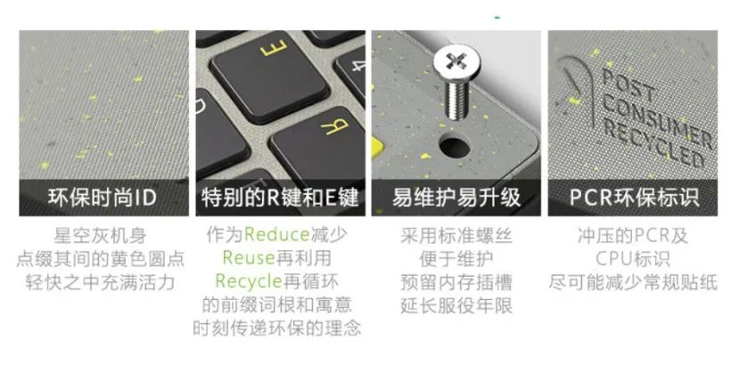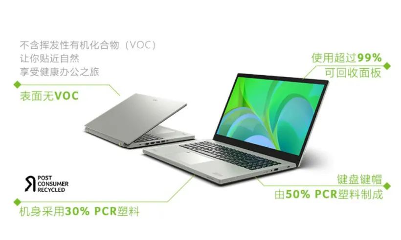 宏碁蜂鸟・未来 环保版笔记本的外壳采用 PCR 再生材质制造,机身和屏幕边框使用了 30% 的 PCR 塑料,键盘使用了 50% PCR 塑料,同时表面无挥发性有机物,安全环保。