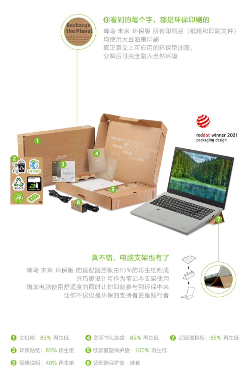 宏碁“蜂鸟・未来”环保版笔记本的包装还采用再生纸制成,同时所有油墨使用了大豆油墨印刷,能够分解。笔记本适配器的包装挡板,还可以折叠起来充当电脑的支架,一物多用。