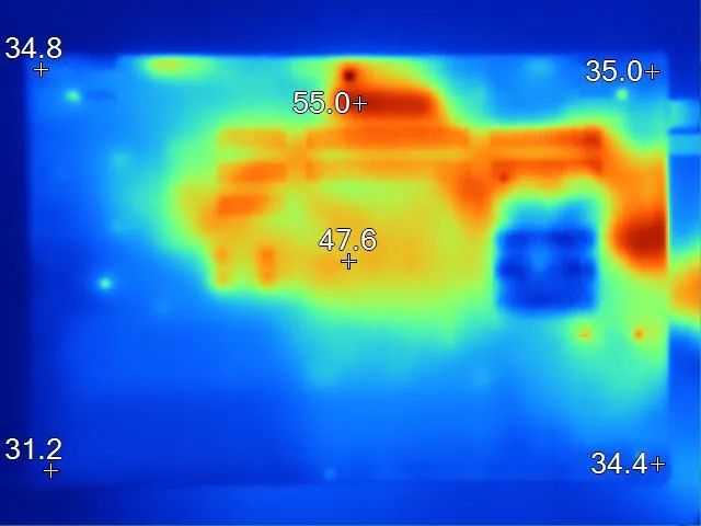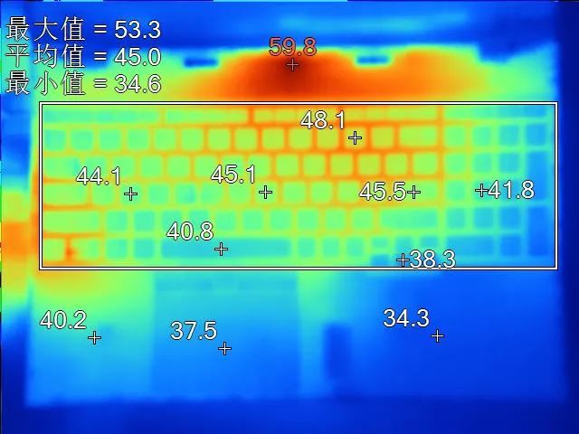 表面温度如上图所示,键盘键帽最高温48.1℃出现在键盘中上区域,WASD键附近约为44.1℃,方向键38.3℃。