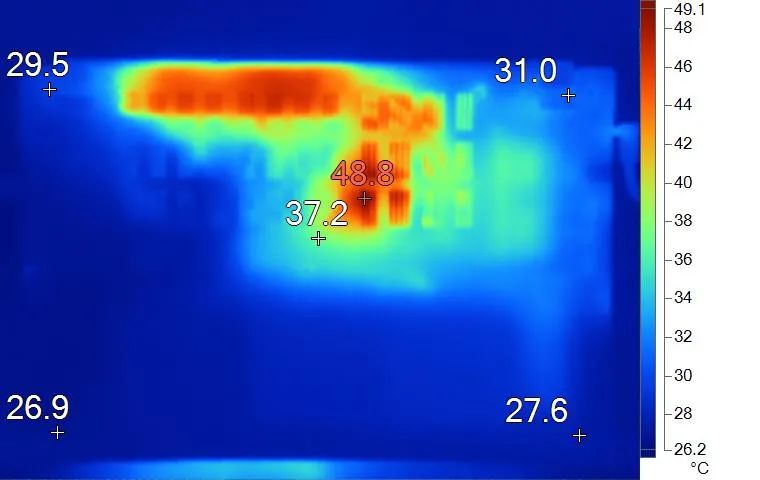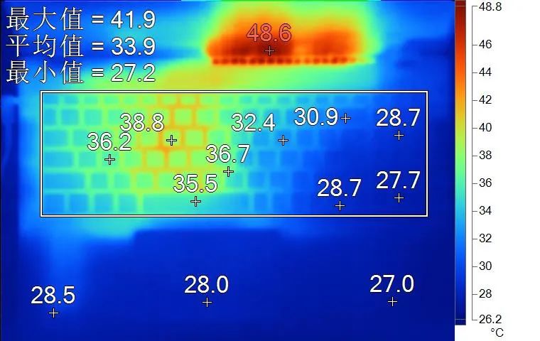表面温度如上图所示,键盘键帽最高38.8℃出现在键盘中部,WASD键36.2℃,方向键28.7℃,左腕托温度为28.5℃,背面中心点37.2℃。