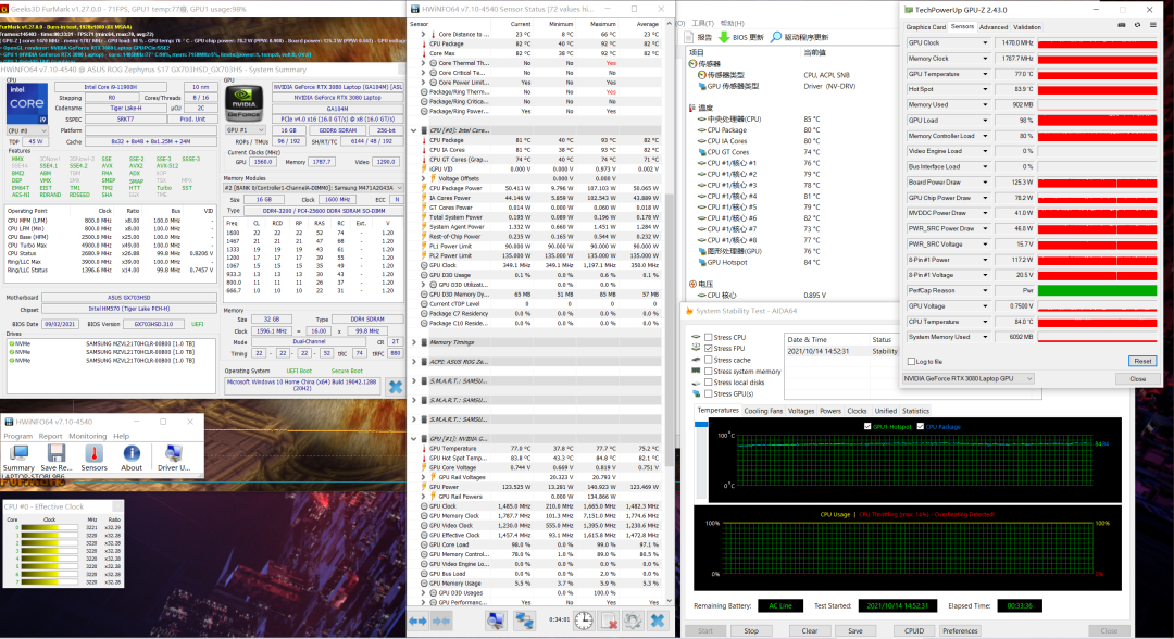 开启手动模式把风扇转速拉满,CPU温度最高93℃,稳定在81℃左右,功耗50W上下,频率3.2GHz左右。