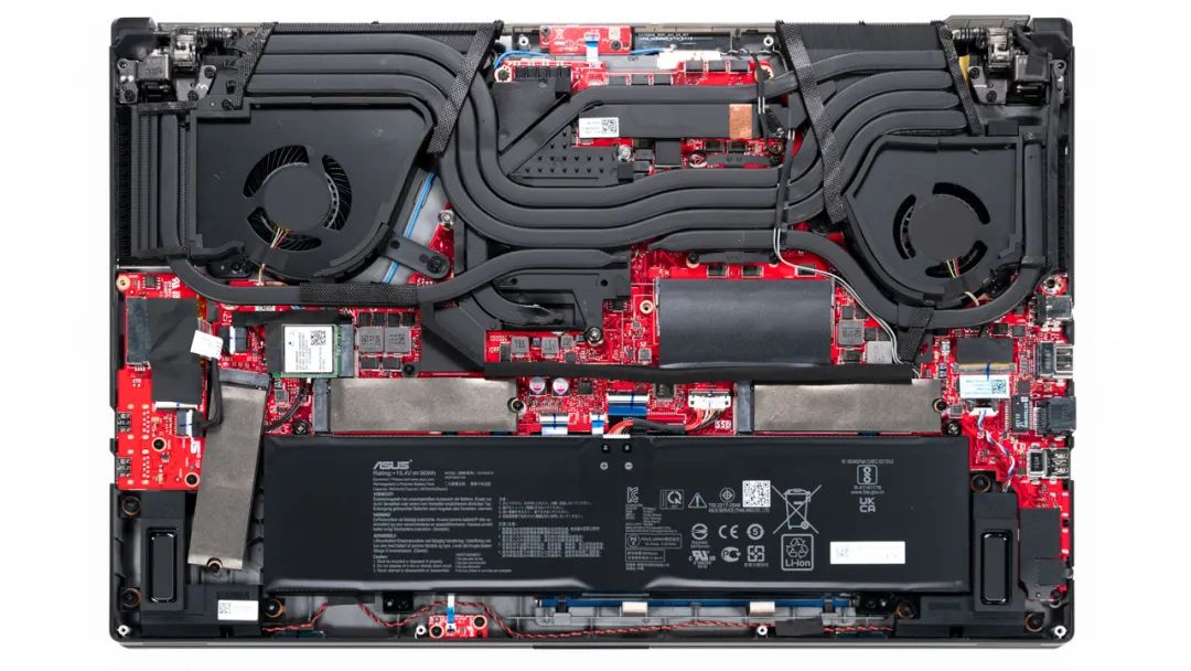 上图是ROG 冰刃5 Plus的拆机实拍图,六热管双风扇的组合。