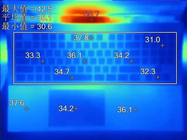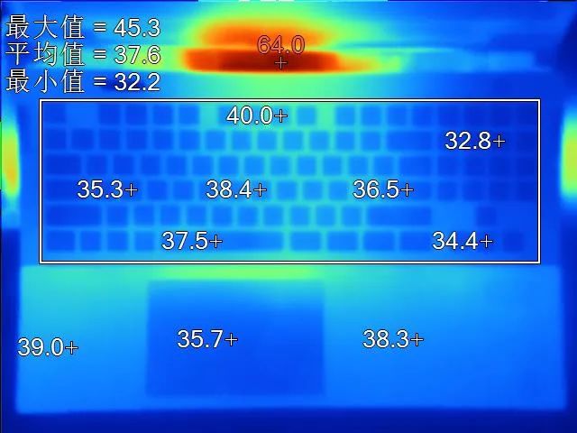 表面温度如上图所示,键盘键帽最高40℃出现在中上区域,WASD键附近约为35.3℃,方向键34.4℃。左腕托温度为39℃。