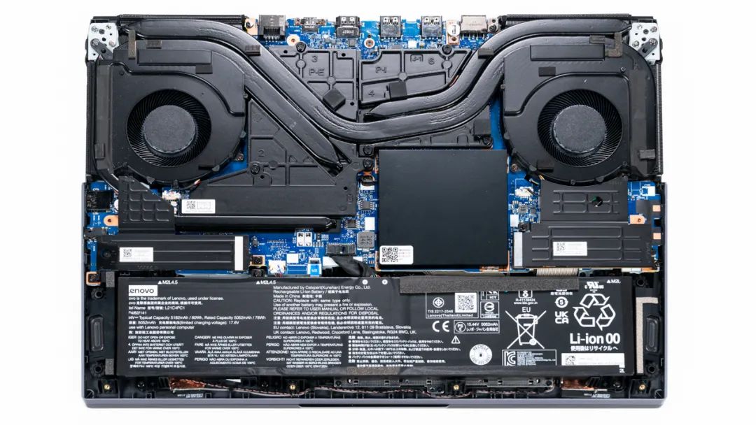 上图是联想 拯救者Y9000P的拆机实拍图,5热管双风扇的组合,还有一根热管藏在显卡侧下方。整体散热布局相比上一代有微调。