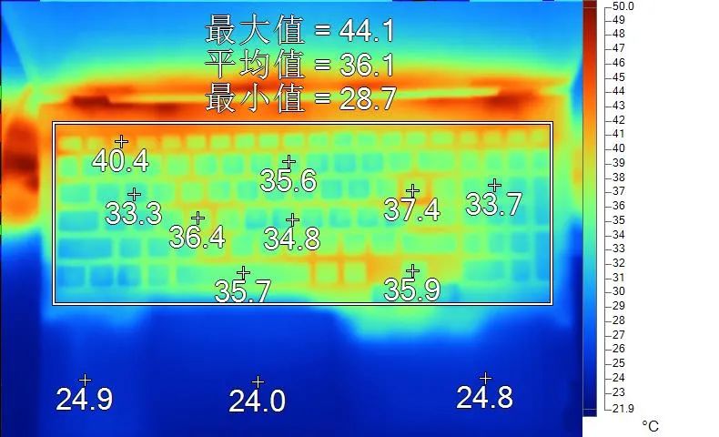 表面温度如上图所示,键盘键帽最高40.4℃出现在F2处,WASD键附近约为33.3℃,方向键35.9℃。左腕托温度为24.9℃。