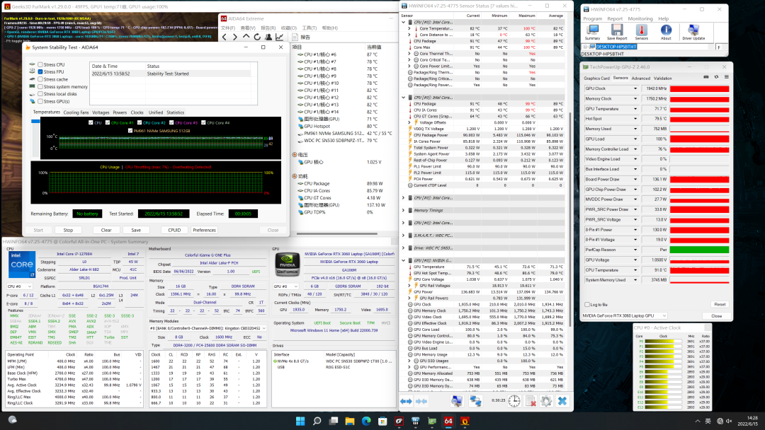 单烤FPU,这颗i7-12700H稳定在81℃,功耗90W,P核频率3.7GHz,E核频率2.9GHz;