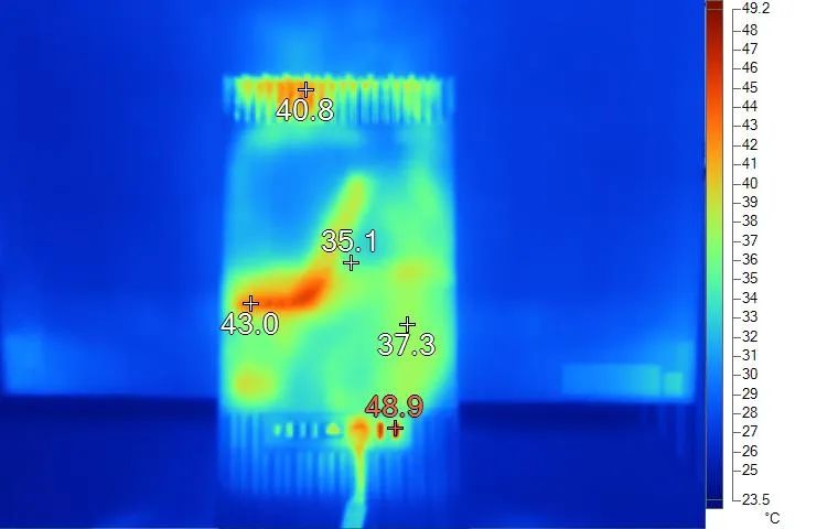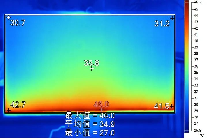表面温度如上图所示,正面最高温度46℃,平均34.9℃;北面最高温度为48.9℃,中心点温度为35.1℃。