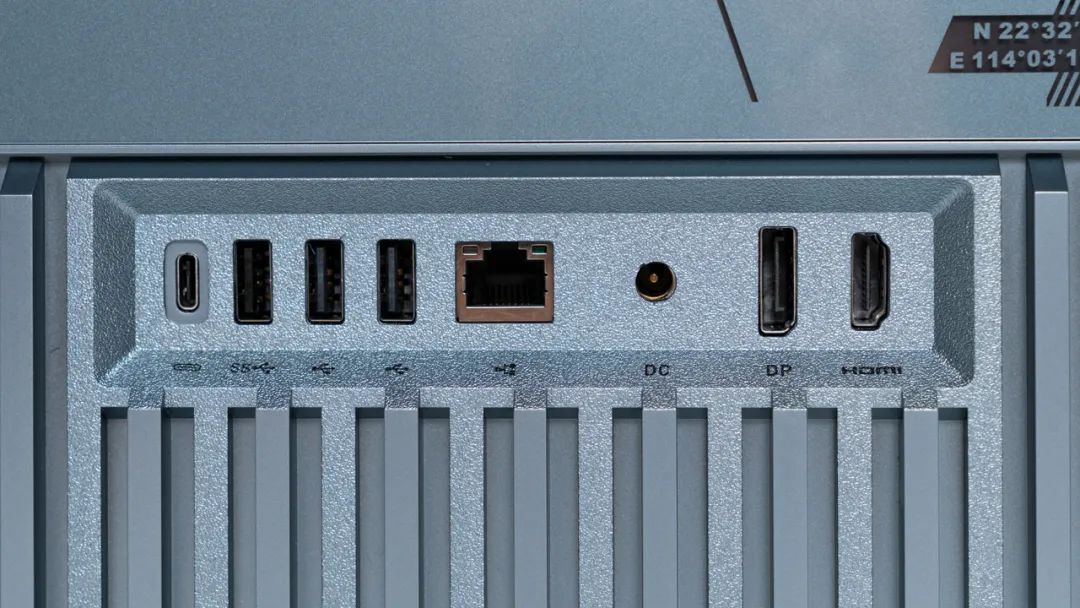 机身后侧依次为USB3.2 Gen2 Type-C、USB3.2 Gen2 Type-A、两个USB2.0接口、RJ45网口、DC电源口、DP1.4
