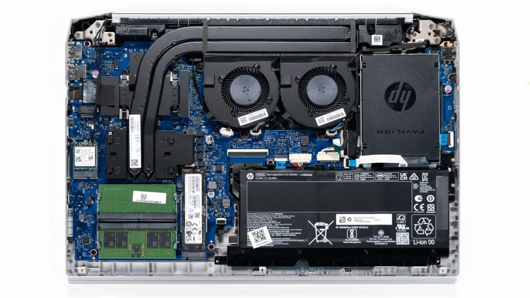 上图是惠普 战99 2022锐龙版的拆机实拍图,双热管双风扇的组合。