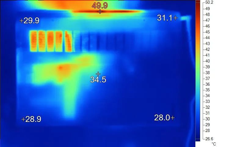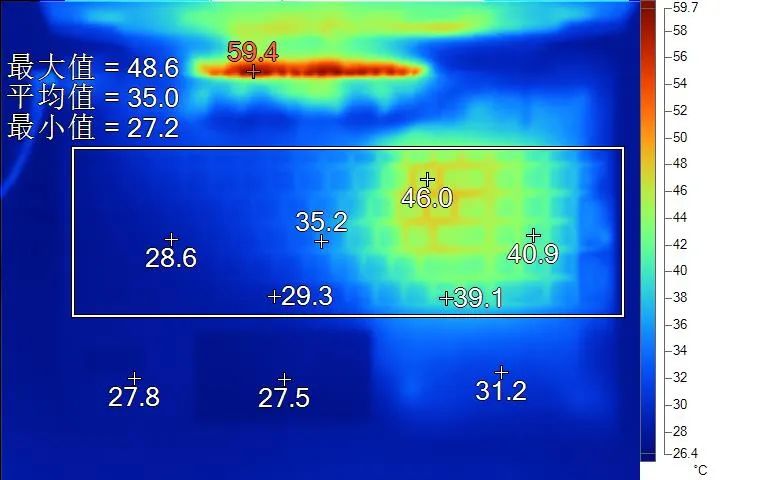 表面温度如上图所示,键盘键帽最高46℃出现在删除键旁边的+号键上,WASD键附近约为28.6℃,方向键39.1℃。左腕托温度为27.8℃。