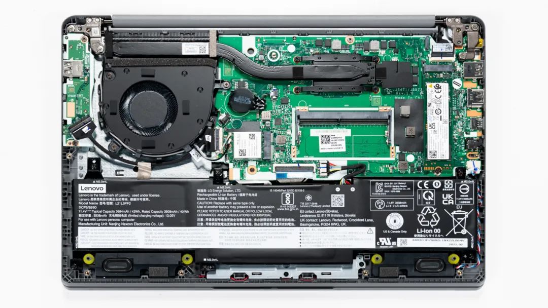 上图是联想 IdeaPad14 2022锐龙版的拆机实拍图, 单风扇单热管的组合。