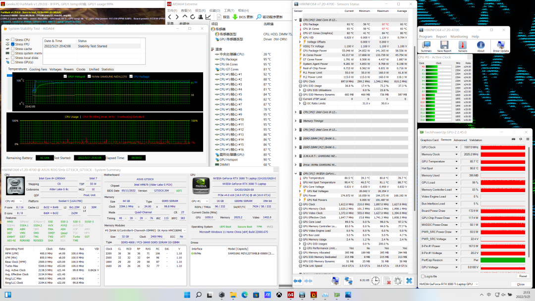 单烤FPU,CPU 95度,封装功耗120W,IA功耗113.6W,P核 3.4~3.5GHz,E核频率2.8~2.9GHz。