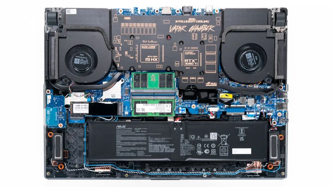 上图是ROG 枪神6 Plus 超竞版的拆机实拍图,双风扇+大面积VC均热板的散热,风扇下面还有两根辅助的热管。