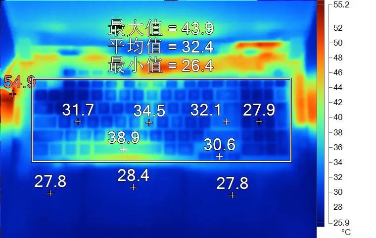 满载状态下的表面温度如上图所示,键盘键帽最热处仅38.9℃,在空格键附近,其他地方几乎没有明显热感。