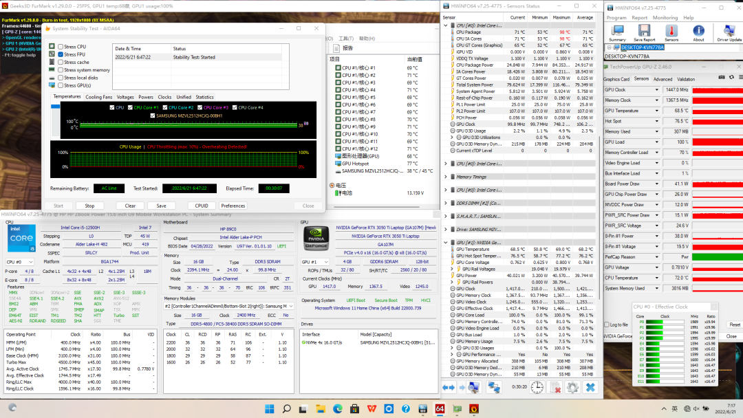 如果单烤显卡,RTX3050Ti稳定在66.7℃,功耗50W,频率1612MHz。