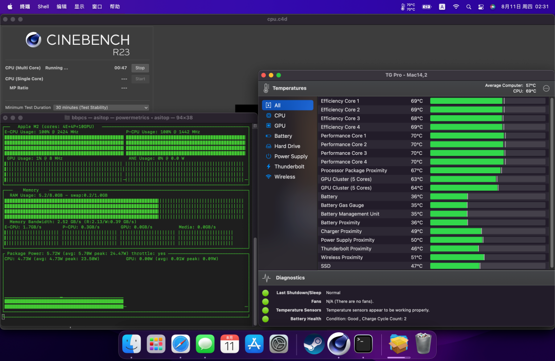 在满载状态下,30分钟后,CPU的P核平均温度稳定在70℃,E核约69℃。大核频率1442MHz,小核频率2424MHz,核心功耗约4.7W,封装功耗约5.7W。