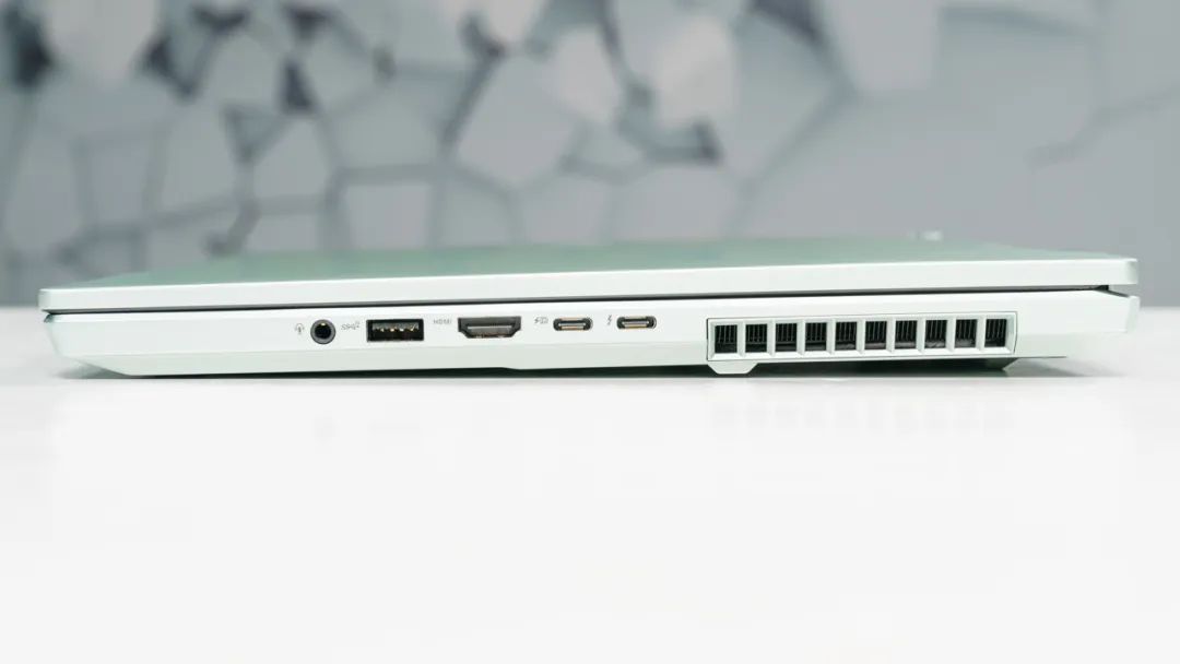 机身右侧有全功能Type-C、雷电4、USB3.2 Gen2 Type-A、3.5mm耳麦接口,以及HDMI2.1接口。