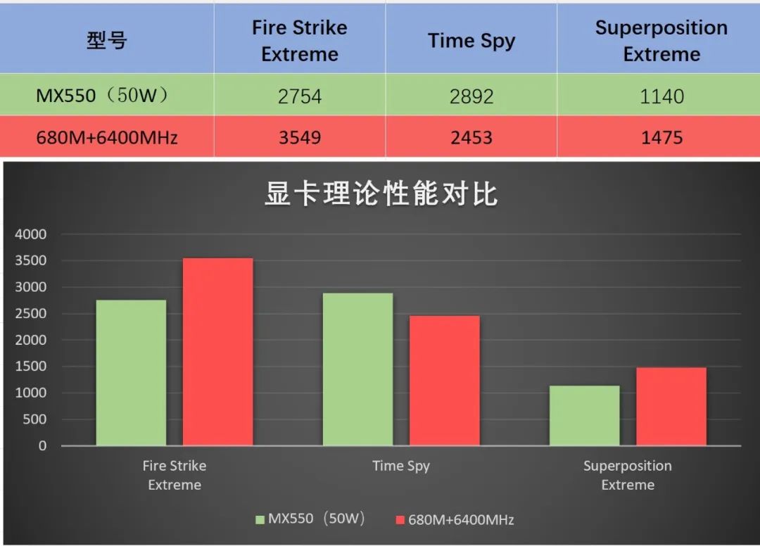 可以看到,DX12的Time Spy里MX550性能更强,其他两项不如680M,说明RX 680M的理论性能堪比独显。